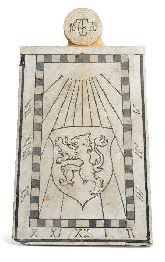 PLAQUE DE CADRAN SOLAIRE en marbre blanc gravé avec réhauts noirs des heures en chiffres romains, armoiries au lion dans un écu.