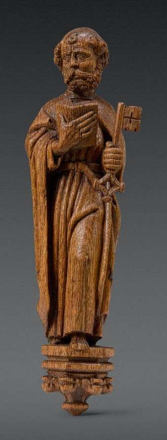 d'applique en chêne sculpté. Debout, vêtu d'une tunique ceinturée et d'une cape, le saint tient la clef emblématique de sa main gauche et un livre de sa main droite. Il repose sur une base architecturée.