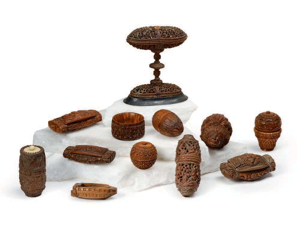 en corozo et buis de douze pièces. Boîtes, tabatières, rond de serviette etc.