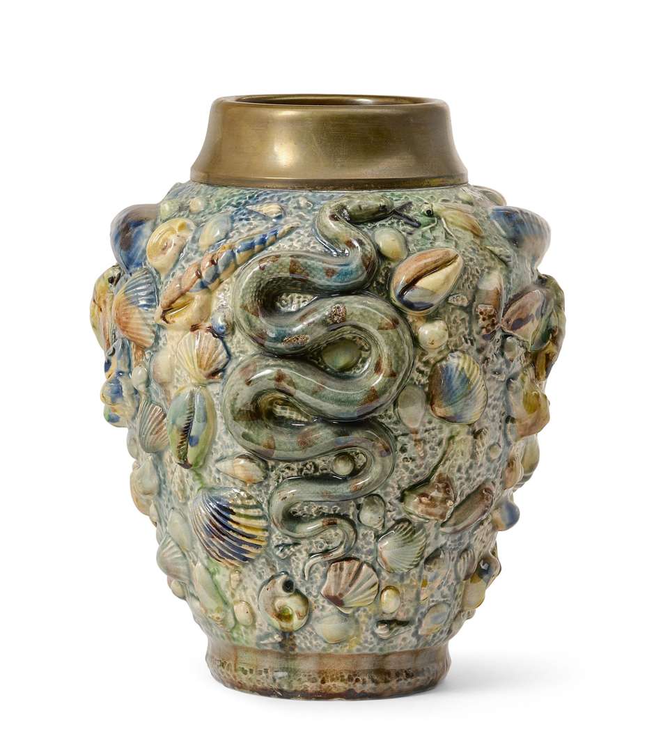 en céramique à décor naturaliste en relief de coquillages, papillon et serpent dans le style de Bernard Palissy.