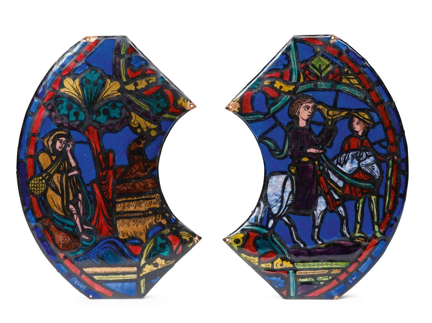 peints sur plaques de cuivre embouties représentant respectivement le départ de l'enfant prodigue et le repentir de l'enfant prodigue d'après les vitraux de la cathédrale de Bourges.