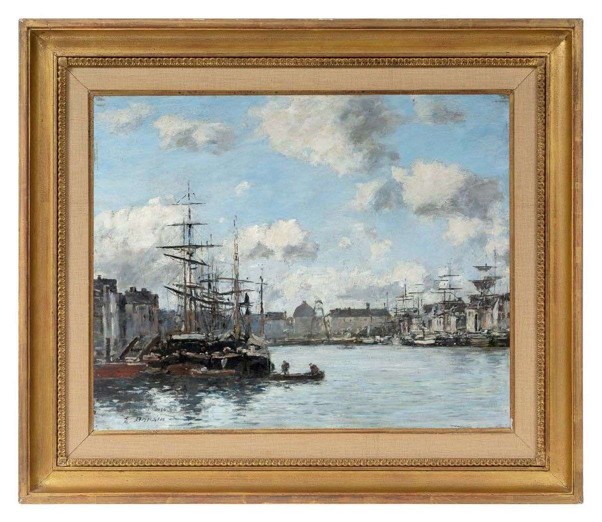 C'est au Havre qu'Eugène Boudin (1824-1898), fils de marin né à Honfleur, ouvre à seulement vingt ans un négoce de papeterie. Il en met à profit la vitrine pour exposer les tableaux des peintres de passage qui, en retour, lui prodiguent leurs conseils et l'incitent à abandonner son commerce au profit de l'art. C'est encore au Havre et grâce aux deux paysages qu'il envoie en 1850 à l'exposition des Amis des arts que Boudin se fait remarquer. Ainsi se voit-il attribuer par la ville une pension qui lui permet pendant trois ans d'approfondir sa technique. S'il fréquente Paris, capitale des arts, il reste fidèle au Havre, à Honfleur et à la ferme Saint-Siméon où il côtoie les peintres connus autrefois et s'adonne à la pratique du plein air. En 1858, c'est sans surprise au Havre qu'a lieu la rencontre capitale entre Monet, tout juste âgé de 17 ans, et Boudin qui l'entraîne sur le motif et l'alerte sur le caractère transitoire de toute chose. L'été suivant, Boudin se lie d'amitié avec Courbet et les deux hommes font la connaissance de Baudelaire qui s'enthousiasme pour ses ciels normands. Après la réussite de la vente aux enchères de ses oeuvres en 1868, Boudin a enfin les moyens de voyager. Il parcourt l'Ouest de la France, se hasarde à Venise et renouvelle son inspiration. Il retourne cependant inlassablement en Normandie pour y décliner ses vues de port, avec une constante prédilection pour celui du Havre, ses scènes de plage - où fleurissent les crinolines - et ses troupeaux. Loin d'être des redites, ces tableaux - à la fois semblables et différents - sont des variations sur un thème qui éclairent sa participation à la première exposition impressionniste de 1874. En 1881, le marchand Durand-Ruel se réserve la production du peintre qui devient un artiste consacré. Il s'éteint en 1898 et se voit célébrer par une rétrospective à l'École des Beaux-Arts en 1899. Il laisse un œuvre abondant qui accorde une place de choix aux vues du Havre, à l'instar de notre tableau au millésime de 1884. Prêté par Jules Choquet à l'exposition de 1899, il est typique du travail de l'artiste par sa touche spontanée, qui ne sacrifie en rien l'acuité de l'observation, et son aspiration à fixer l'éphémère - eau, air, humanité en mouvement - dans le droit fil des Impressionnistes alors au sommet de leur art.