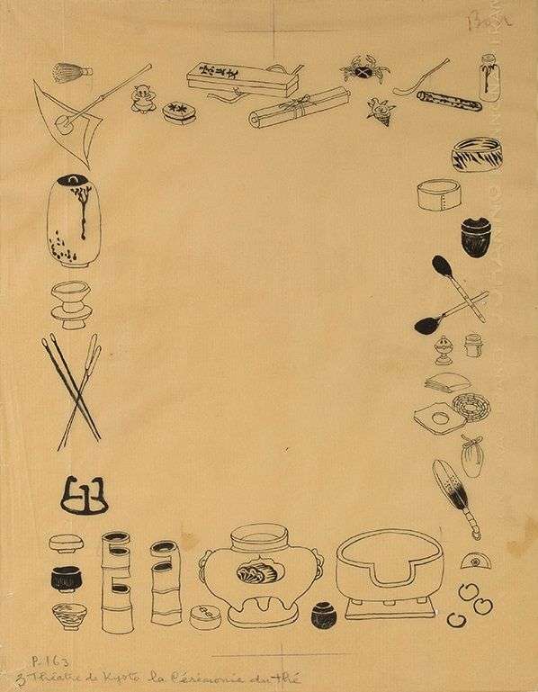 Annotée ‘P. 163', située ‘Théâtre de Kyoto', titrée ‘La cérémonie du thé' et numérotée ‘3' en bas à gauche