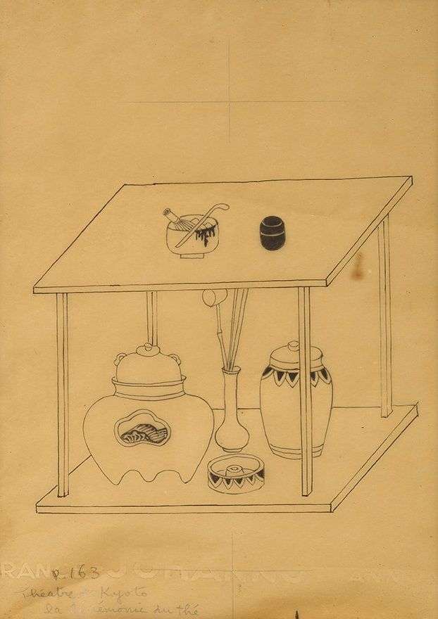 Annotée ‘P. 163', située ‘Théâtre de Kyoto' et titrée ‘La cérémonie du thé' en bas à gauche