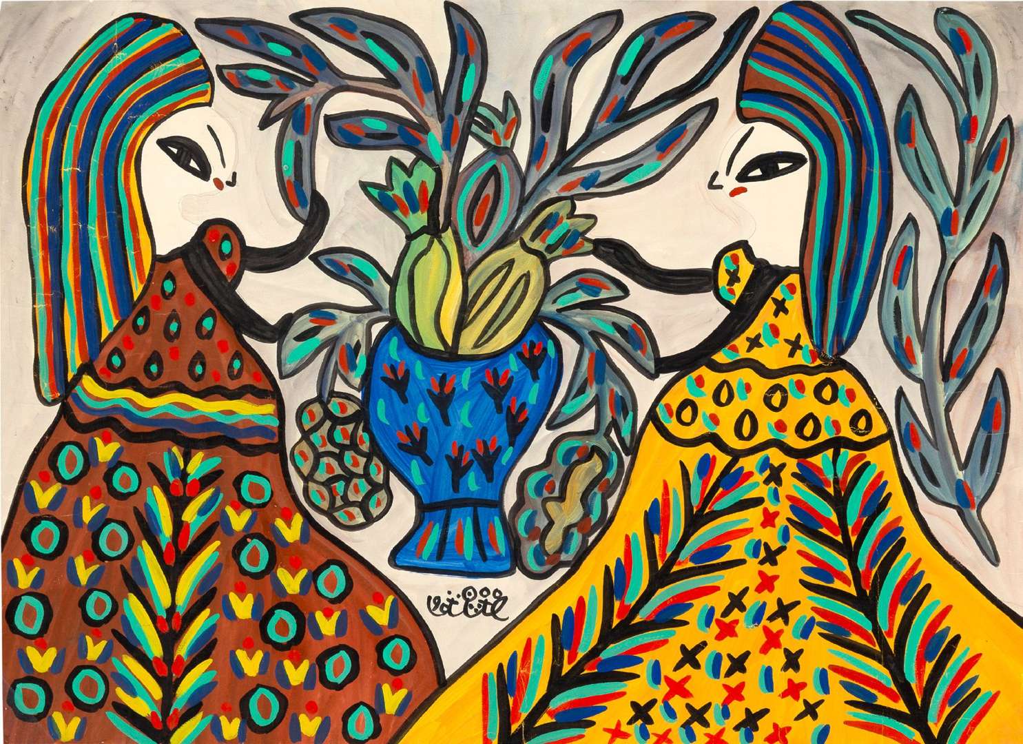 « [...] Dans ce que Baya peint, deux choses frappent au premier abord : la profusion des couleurs, puis le jaillissement, le déroulement intarissable de l'arabesque, naturel comme un chant d'oiseau, mais moins stéréotypé, plus diversifié. On s'approche, et l'on découvre un monde fabuleux, de plantes, de fleurs, d'oiseaux, habité par des femmes aux robes somptueuses, coiffées de hauts bonnets à la crétoise, à la fois de face et de profil, à l'oeil immense, fendu en amande, comme la Parisienne des fresques de Cnossos en Crète, jeune de 3 000 ans... La mise en page - la mise en place - des éléments du tableau est presque toujours d'une sûreté inouïe. Baya joue des plans avec, toutes proportions gardées, l'intuition d'un Matisse. De même pour les tons, qui sont purs, mais aussi inventés de toutes pièces | étendus à plat bien entendu. Parfois le rapport poétique des couleurs fait songer à Chagall. Ou bien l'on se rappelle l'art populaire russe, ou encore cet Orient féérique recréé par Kandinsky. Car Baya, plus préoccupée de son idée, de son rêve, que de réalisme, frôle également l'abstrait. La démarche est d'ailleurs toute naturelle. Ici, je me réfère à un livre passionnant récemment paru (Les origines de l'Art français, Guy de Prat éditeur). C'est cependant un manuel très serré de l'histoire de l'Art. Mais le sujet étudié, entre autres, par M. Raymond Lantier, et particulièrement neuf - mal connu - est actuel au surplus, car il s'agit de l'art primitif. La Berbère Baya, nous dit-on, est peut-être 'l'héritière des grands artistes pré historiques de l'époque magdalénienne.' Or, à cette époque, nous dit M. Lantier, on a affaire en art, non à un 'réalisme visuel', mais à un 'réalisme intellectuel', abstrait, à des 'images très simplifiées d'emblée, parfois ornemanisées et groupées en décorations d'apparence géométrique', où les courbes et contre-courbes jouent le rôle essentiel. C'est que l'artiste préhistorique cherche beaucoup moins à représenter la réalité qu'à 'se représenter soi-même.' Il retrouve alors pour le monde un pouvoir - magique ou poétique, à votre gré - que sinon il n'eût point possédé. Enfin, à remonter ainsi aux sources de la création - la sienne et l'autre - il prend contact avec une réalité plus mystérieuse, plus vraie pour lui que la réalité extérieure, il se trouve devant le sacré. Ainsi Baya. Et les statuettes de terre cuite qu'elle modèle et peint ont l'étrange et inquiétant pouvoir d'évocation des statues-menhirs de l'âge du cuivre et du bronze. Mais sa magie est plus souvent une magie blanche. Baya, qui 'tient et ranime le rameau d'or', écrit magnifiquement André Breton, et 'dont la mission est de recharger de sens ces beaux mots nostalgiques, l'Arabie heureuse', nous annonce une ère où l'homme, réconcilié avec ses rêves, pourrait vivre en amitié avec la nature - avec soi-même. »