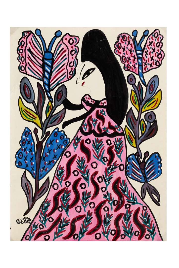 « S’il doit y avoir une femme, je commence par la femme, puis je dessine les instruments ou alors un vase de fleurs, ou... cela dépend. Je commence, en général par la femme, le reste vient après. La femme est le centre, le reste se place autour d’elle. Si c’est [sic] des instruments uniquement, je commence par les instruments et dessine les autres objets ensuite. Dans une seconde étape, je m’occupe des couleurs : couleurs de la robe d’abord puis couleur des cheveux. Si je mets un foulard sur la tête, je colore le fond du foulard après celui de la robe, si ce sont les cheveux, que je fais noirs, libres, je les laisse pour plus tard, avec les yeux. Ensuite je cerne : là aussi je commence toujours par la femme, les cheveux noirs, l’oeil, puis les autres instruments ou objets | je les cerne tous, et pour finir je m’attaque aux dessins qui vont peupler le fond. »