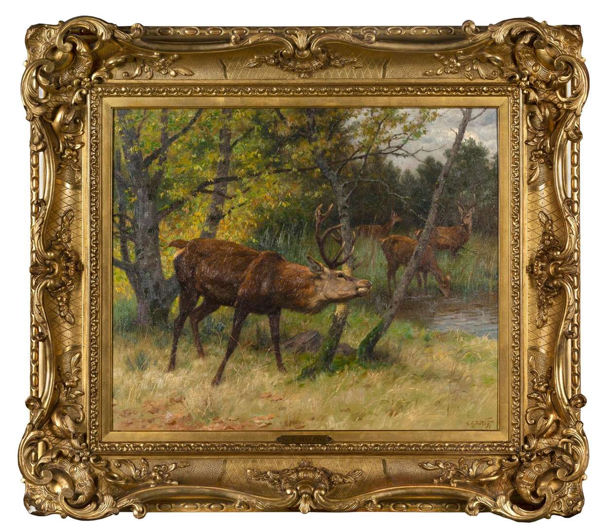 Cerf frottant ses bois contre un arbre, jeune cerf et biches, 1910