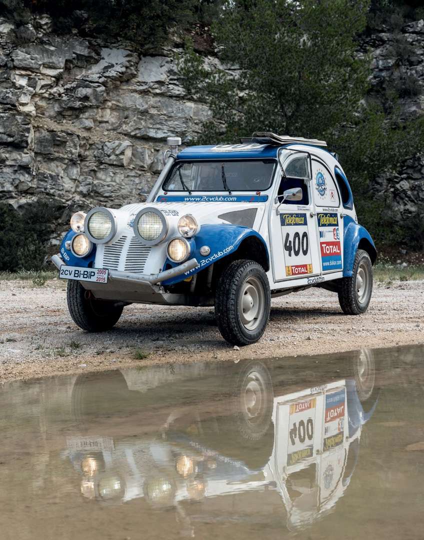 31 décembre 2004, Barcelone | une improbable Citroën 2 CV bleue et blanche s’im-misce au milieu des 4x4, motos, quads et camions sur le podium départ du 27e Dakar, le rallye-raid le plus dur et le plus médiatisé au monde. Depuis la première édition, en 1979, organisée par le « gourou » Thierry Sabine, la fameuse caravane du Dakar a vu défiler tout un tas d’engins plus improbables les uns que les autres, de la Rolls-Royce Corniche de Thierry de Montcorgé (vendue en 2021 par Aguttes, et très bientôt au départ du Dakar Classic) jusqu’aux Citroën ZX Rallye-Raid (également une spécialité d’Aguttes…), authentiques Gr. B transformés en F1 du désert. La 2 CV qui illustre ces pages se rapproche plus de la Rolls Jules que d’un Pajero usine, au niveau de son histoire, de sa conception et de ses performances.Pour comprendre la genèse et l’histoire de Bi-Bip, c’est son nom, il faut se replonger dans l’histoire du Mehari Club Cassis, l’incontournable garage spécialisé dans la rénovation et la reconstruction de Mehari et 2 CV, sous l’oeil attentif et officiel de Citroën. L’Aventure commence dans les années 1980, lorsque trois frères, Georges, Gilles et Philippe Marquès, lancent leur acti-vité à proximité de l’agence Citroën de leur père. Ils rénovent et personnalisent tout d’abord des Méhari avant de créer quelques années plus tard leur propre catalogue de pièces de rechange. Reconnaissante de leur travail pour faire perdurer la passion des voitures aux chevrons, Citroën leur confie en 1998 ses outillages d’origine afin de reproduire les pièces de Méhari dont elle arrête la production. Le même passage de relais aura lieu au début des années 2000 avec la 2 CV. Les équipes de Cassis perpétuent depuis cette tradition et cette expertise unique qui leur permettent de préserver ce pan du patrimoine de l’automo-bile française. Cet engagement constant dans l’excellence a d’ailleurs été récompensé par le Label Entreprise du Patrimoine Vivant qui distingue les sociétés françaises disposant de savoir-faire artisanaux et industriels d’exception, et fait d’elle la référence incontournable pour tous les amoureux de la marque aux chevrons et de ses modèles mythiques : 2 CV, Méhari, Dyane.Au début des années 2000, l’intrépide Georges Marquès rêve de Dakar et parvient à embar-quer avec lui l’entreprise familiale pour cette grande aventure médiatique et technique, qui fera beaucoup pour l’image de la marque. Avec ses mécanos, ils décident de construire un prototype basé sur le principe de la 2 CV Sahara, qui a déjà fait ses preuves. C’est, pour rappel, la seule voiture de série au monde à posséder deux moteurs et deux boîtes de vitesses. Construite à moins de 700 exem-plaires entre 1958 à 1966, cette Deuche est un véritable 4x4 tout-terrain, capable de grimper des pentes de plus de 45 % et de dépasser les 100 km/h ! Vu la rareté et la valeur des Sahara (on en a vu dépasser les 100 000 € !), Mehari Club Cassis décide de partir de pièces neuves et de construire une Sahara 2.0. Caisse allégée, ski intégral, moteurs préparés, châssis sur-mesure, bloc capot en polyester, batterie de phares adaptés à l’obscurité du désert, arceau intégral, gros réservoir d’essence, baquets, harnais, etc… Flanquée du numéro 400, la 2 CV baptisée Bi-Bip (amalgame de Bip-Bip, le grand oiseau bleu très rapide sans cesse pourchassé par Coyote dans le cartoon éponyme, et de Bi, pour bimoteur !) a fière allure au départ du Dakar 2005. Jusqu’au 4 janvier, elle enchaîne honorablement les spéciales, même si sa faible puissance ne lui permet que de pointer en fin de classement. Le 5 janvier, des soucis d’em-brayage notamment lui font passer la ligne d’arrivée hors délais… Qu’à cela ne tienne, portée par son statut de vedette des paddocks et de chouchou des médias, la valeureuse 2 CV Bi-Bip ralliera Dakar par la piste. Un authentique exploit, même loin du classement.Depuis lors, l’iconique 2 CV bimoteur blanche et bleue a joué les stars sur quelques salons, et dans le showroom du Mehari Club Cassis, qui a décidé qu’il était temps qu’elle sorte de cette retraite trop peu active. Elle attend donc un amateur de 2 CV qui souhaiterait compléter sa collection avec un prototype de course his-torique, ou un gentleman driver à la recherche d’une auto médiatique pour le prochain Dakar Class