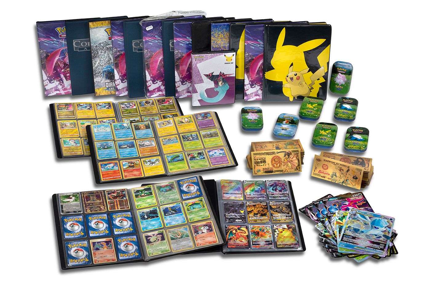 Large collection contenant quelques exemplaires remarquables de Dracaufeu mais aussi Mewtwo, etc. S'ajoute au classeur, 3200 cartes communes en excellent état ainsi qu'un lot de 106 billets Collector Or Pokémon et 88 billets Collector Or Sakura.