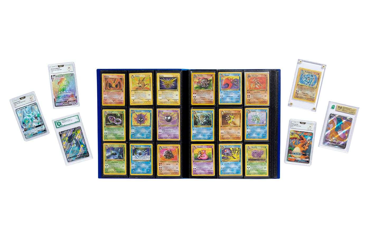 On y ajoute 5 cartes gradées en parfait état dont deux Charizard (Dracaufeu) et un Mackogneur 1re édition du Set de base.
