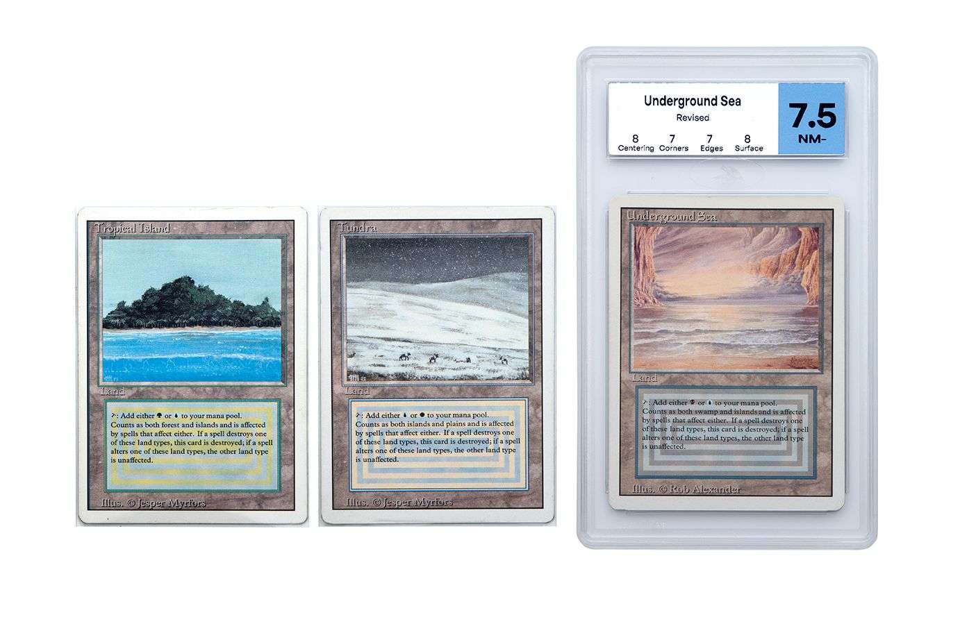 État : cartes gradée Underground Sea MTG Grade 7,5, Tundra et Tropical Island Excellent.