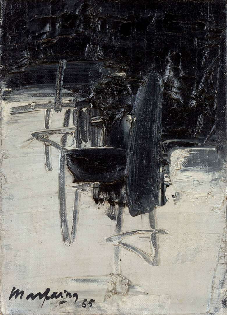André Marfaing, né à Toulouse en 1925 et mort à Paris en 1987, est un des plus grands représentants Français du courant de la peinture informelle. Il se lie d’amitié avec Alfred Manessier et Pierre Soulages dès les années 1950 et leur influence directe sur son travail se fait immédiatement ressentir. En revanche, loin de n’être qu’un suiveur, il développe individuellement sa propre esthétique, en parallèle de celle des plus grands noms de son époque. Décédé à l’âge de 62 ans, sa carrière n’aura pas la longévité de celle de Pierre Soulages, mais la qualité de sa production rivalise très certainement avec celle du peintre Occitan. Longtemps resté dans l’ombre du maître de l’outrenoir, André Marfaing se démarque par des toiles contrastées, binaires, refletant d’une recherche d’absolu. Il écrivait lui-même : « La lumière me touche plus que la couleur. », « Le noir et le blanc me semblent avoir le caractère de simplicité, d’absolu et de rigueur qui me convient ». Cette huile sur toile de 1968 illustre ces propos avec exemplarité : représentant le sempiternel affrontement entre lumière et obscurité, les deux « non-couleurs » semblent couler l’une vers l’autre, chacune envahissant l’espace de son antagoniste, incapables de se résoudre à une neutralité consensuelle.