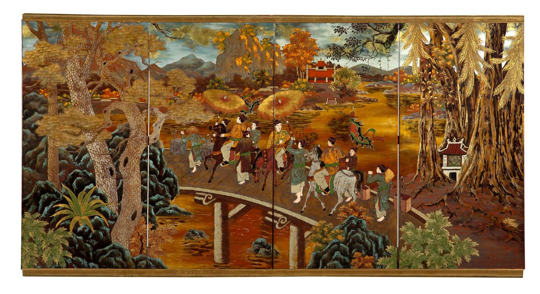 La peinture sur laque est au Vietnam un art majeur, indissociable de l’histoire culturelle du pays. Art traditionnel par excellence, il rayonne également à l’étranger et fait du Vietnam un bastion de cette technique ancestrale. Si ce savoir-faire remonte au XVe siècle, son rayonnement actuel doit beau-coup à l’impulsion de JosephInguimberty au sein de l’École des Beaux-Arts de l’Indochine qui introduit des cours de laque dès 1927. Grâce à de nouveaux moyens rendus possibles par la moder-nité de l’École, celui-ci redéfinit clairement le processus créatif de la laque tout en introduisant de nouveaux principes. Aidé d’Alix Aymé, artiste libre et talentueuse, ils enrichissent notamment l’emploi des couleurs. Traditionnellement, seuls le rouge, le noir, le brun mais aussi l’argent et l’or sont représentés. Grâce à l’introduction de matières nouvelles comme la coquille d’œuf, le sulfure de cadmium ou encore l’oxyde de chrome, d’autres couleurs telles le blanc, le jaune ou encore le vert apparaissent. Ce renouveau créatif n’a depuis cessé de s’effectuer et permet aux artistes d’imposer cette technique asiatique comme l’égal de la peinture occidentale.