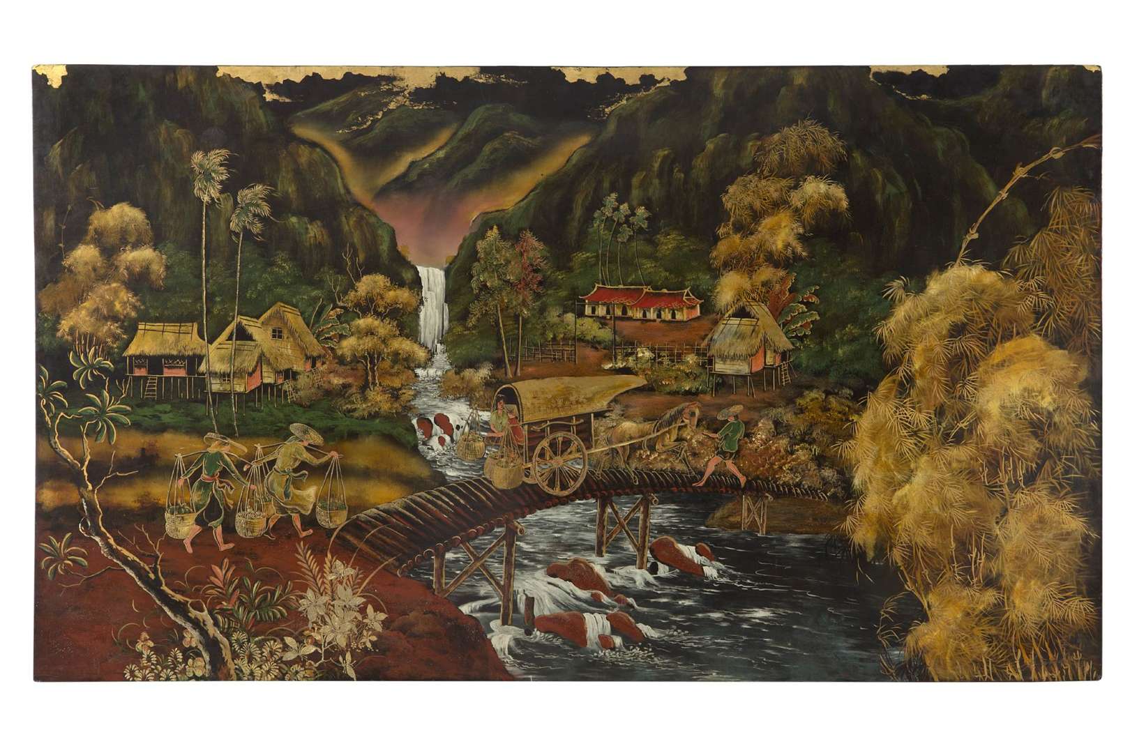 Laque, rehauts d'or et de nacre pillée, signée en bas à droite
