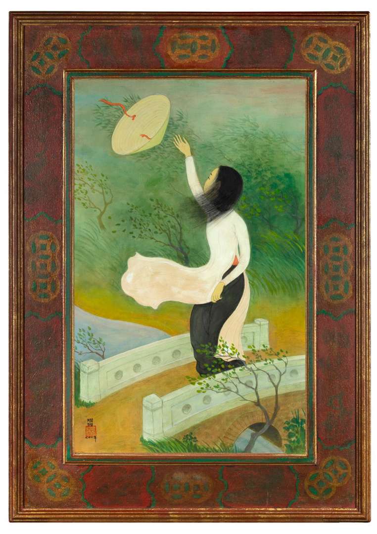 Peintre de la féminité, Mai Trung Thứ a fait des femmes l’un de ses sujets favoris. A la toilette, maternant ou contemplative dans un paysage, l’artiste rend hommage à la beauté des femmes de son pays. Son modèle reprend ici les canons asiatiques : figure longiligne, cheveux d’un noir ébène, teint porcelaine. Les origines de la jeune femme se lisent également à travers sa tenue typiquement vietnamienne : elle porte un áo dài, costume traditionnel féminin créé au XIIIe siècle. Il est formé d’une robe à deux pans portée pardessus un pantalon mettant ainsi en valeur la silhouette féminine. De sa main droite elle tente de rattraper un chapeau conique qui s’envole. Chapeau traditionnel, appelé nón lá, sa création remonterait à l’âge du bronze, au Ier millénaire avant J.-C. Ce chapeau est réalisé entièrement à la main en feuilles de lataniers. Un ruban en soie permet de relier les deux extrémités. S’il était à l’origine utilisé par les paysans pour se protéger du soleil et de la pluie lors des travaux des champs, il est depuis devenu un accessoire de mode en ville, porté sur un áo dài.