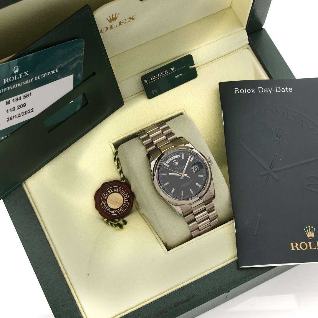 Avec : un écrin et sa surboîte, un écrin de voyage et sa surboîte, une carte de garantie de service en date du 26.12.22 (toujours sous garantie Rolex jusqu'en décembre 2024), un livret Day-Date, un manuel de garantie et deux tag Rolex