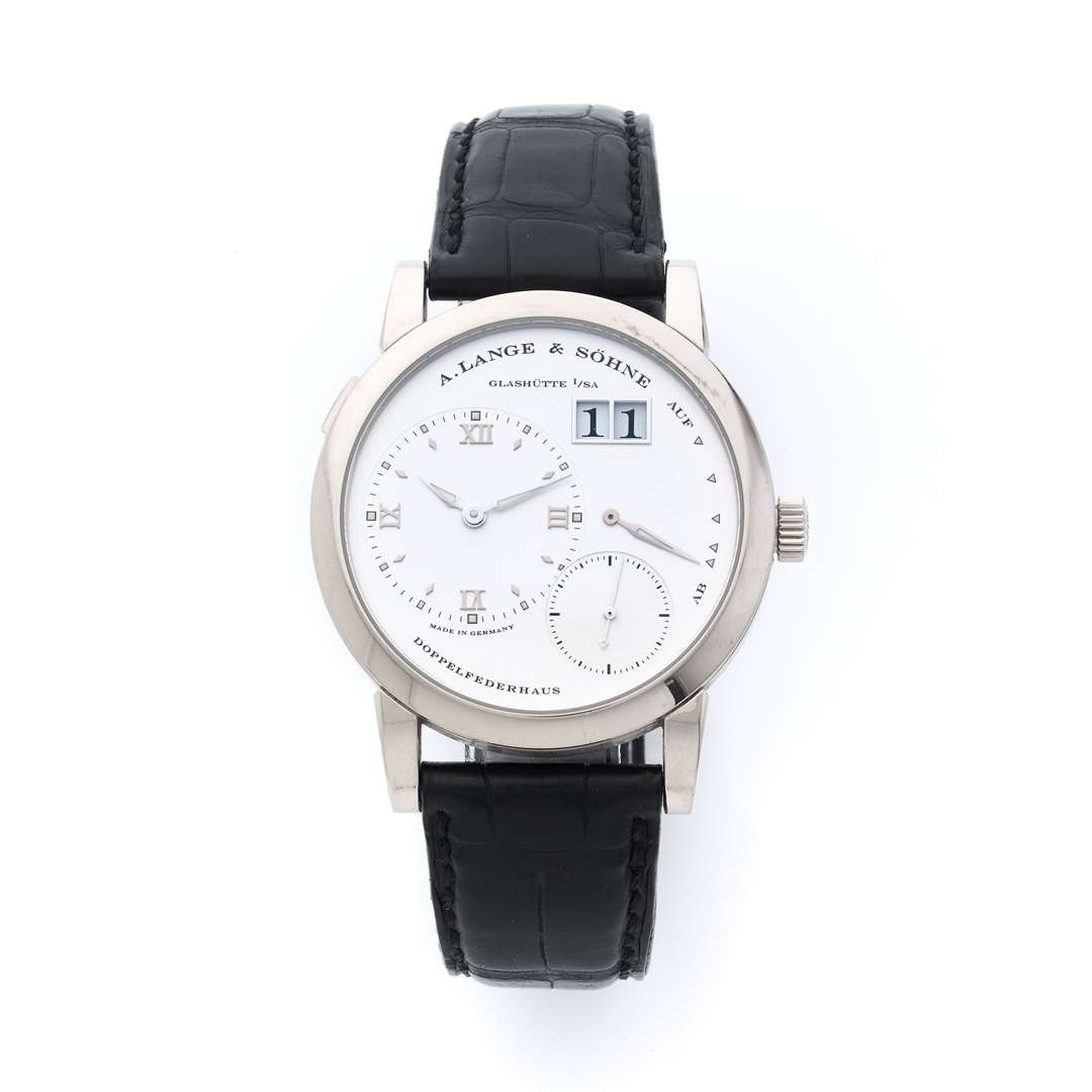 A 18k white gold manual winding wristwatch with date display and power reserve by Lange & Söhne