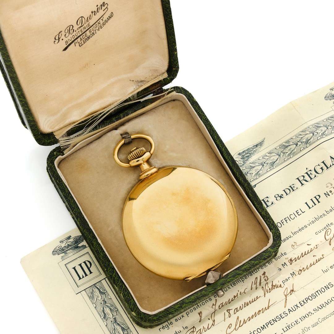 Avec : un écrin de la maison Durin à Clermont Ferrand avec un bulletin de marche et de réglage à la date du mois de janvier 1913, chronomètre officiel Lip No. 375074