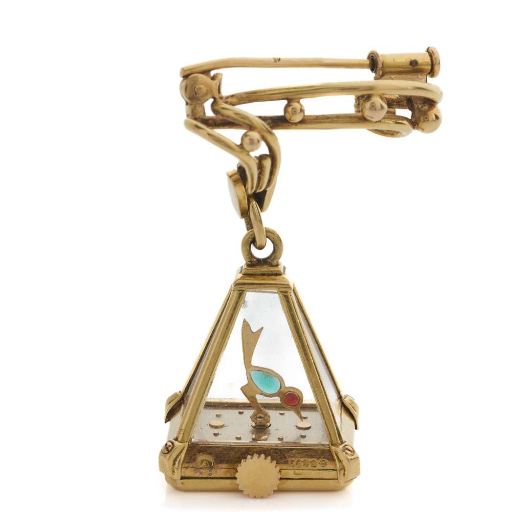 A 18k yellow gold pendant watch showing "bird in a cage" signed UTI
