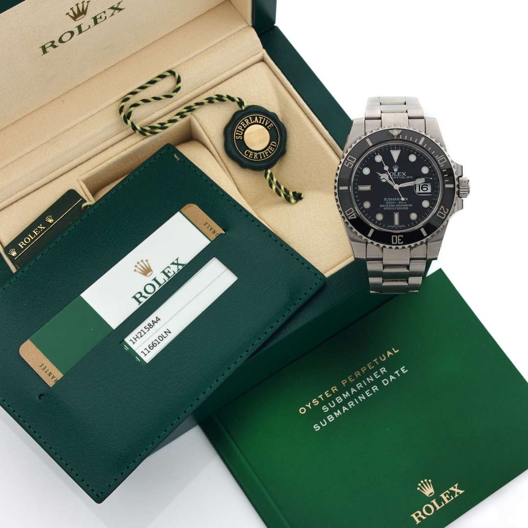 Cadran : noir, index cerclés, aiguilles luminescentes, trotteuse centrale, minuterie chemin de fer, date à guichet, verre saphir cyclope, signé