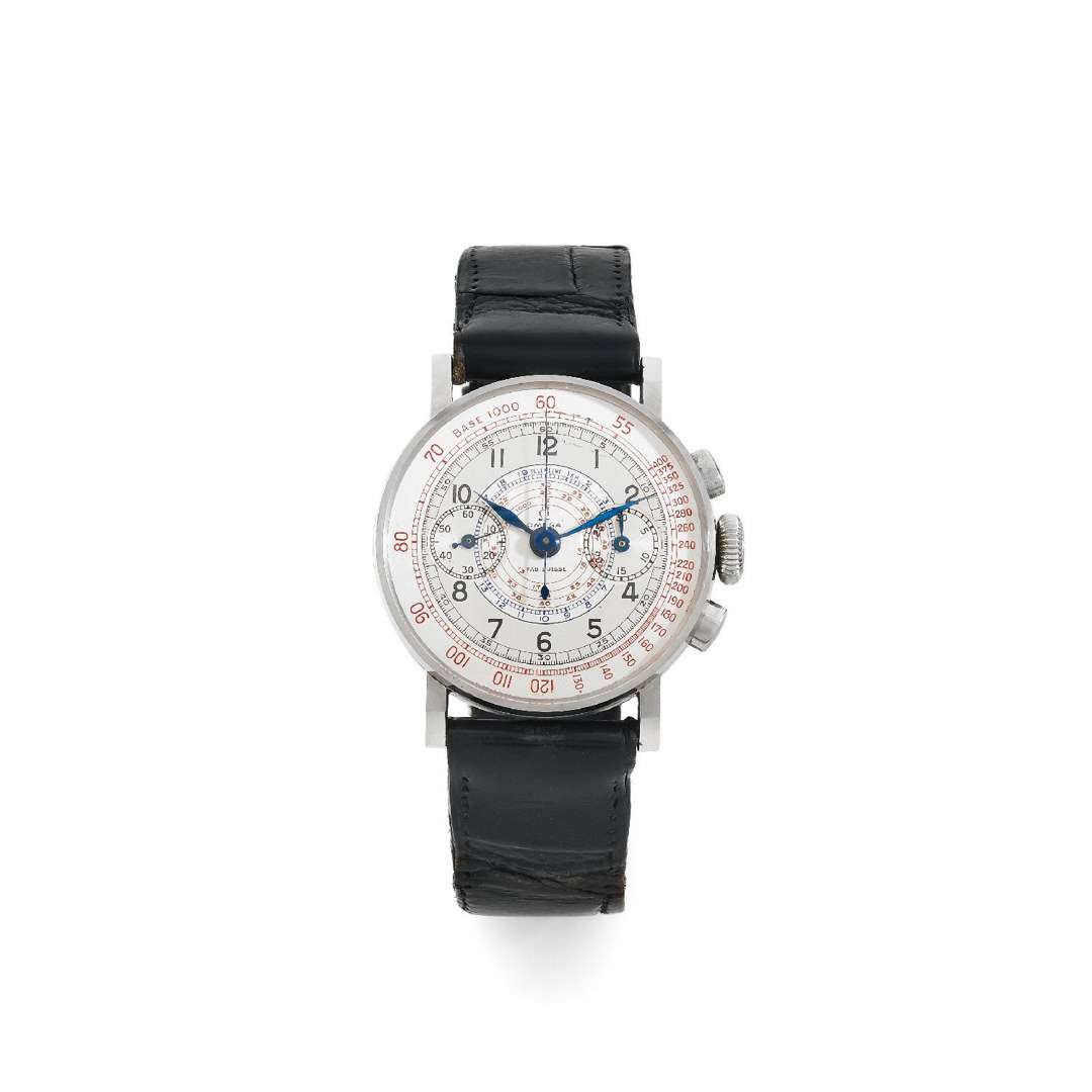 Cadran : argenté deux tons, chiffres arabes, deux compteurs pour l'indication des 30 minutes et des secondes, échelle et tachymètre, signé