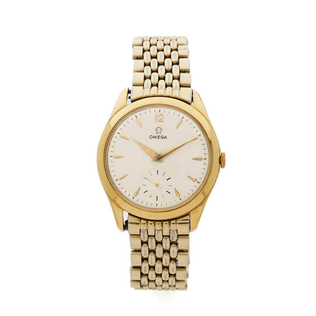 A 18k yellow gold manual winding wristwatch with gold plated bracelet signed by Omega