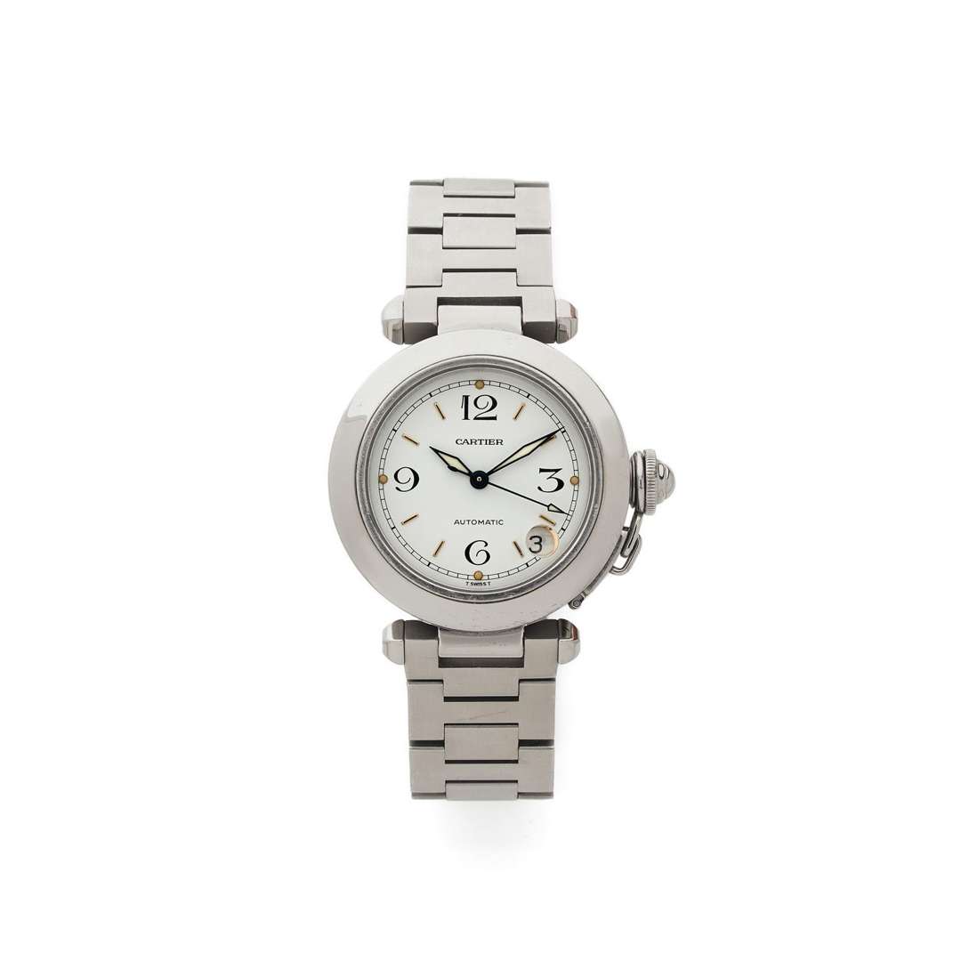 Cadran : blanc, index chiffres arabes et index "bâton" appliqués, trotteuse centrale, date à guichet, signé
