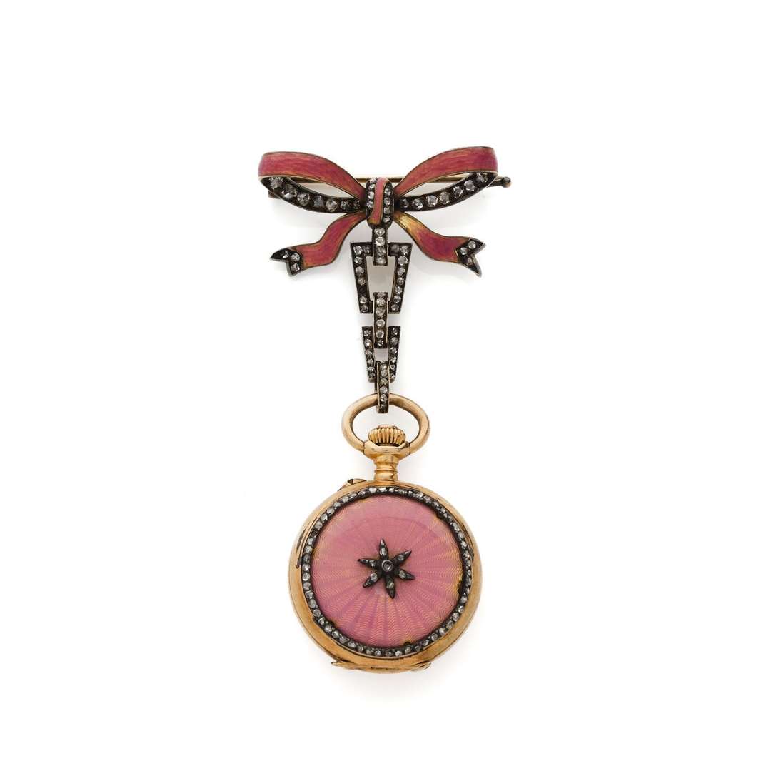 Boîtier : rond sur charnière, cuvette en or signée et numérotée, le dos avec un émail rose dans le goût de Fabergé avec entourage de brillants