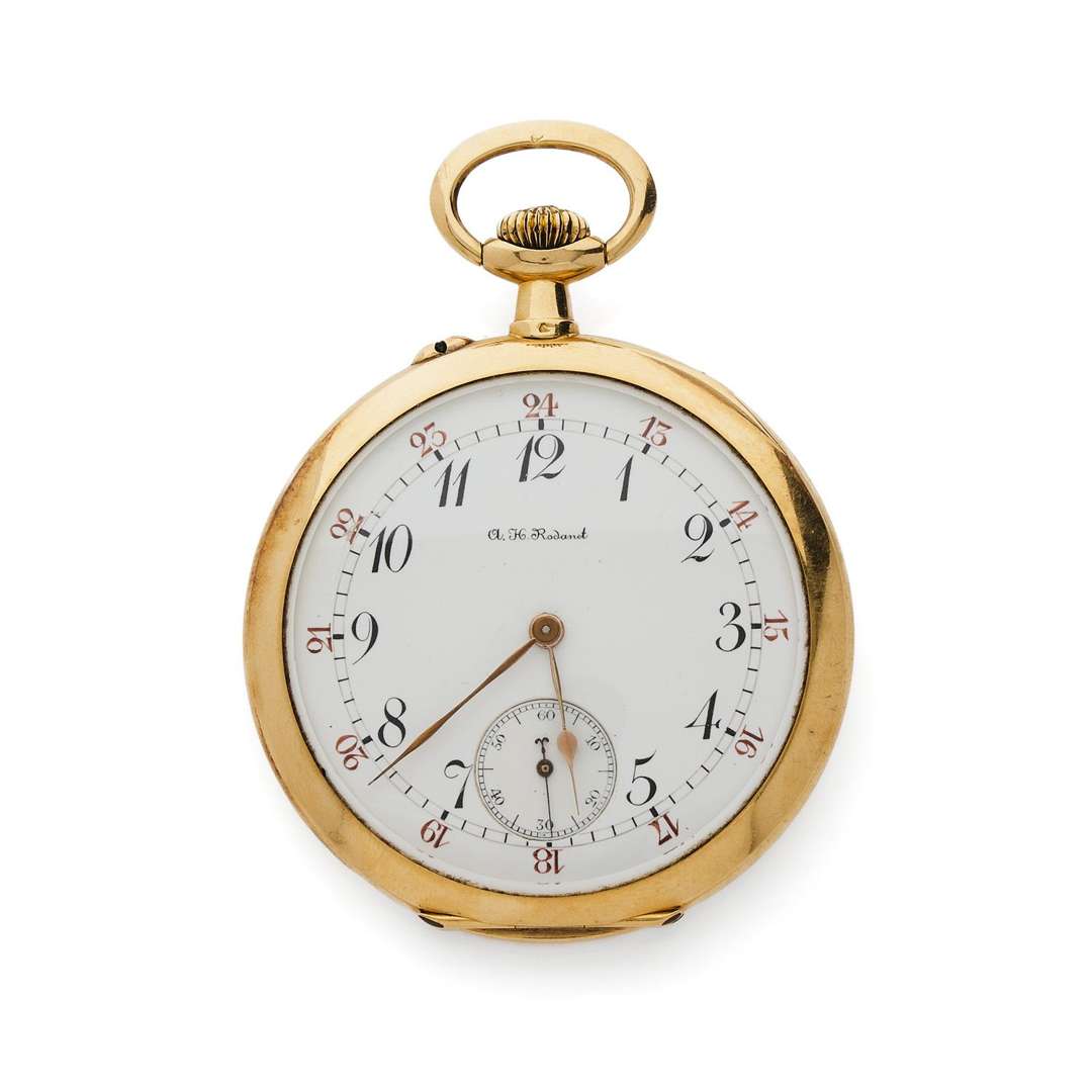 Boîtier : rond sur charnière, le dos gravé avec des initiales, la cuvette en or signée et numérotée, porte l'inscription « 14 mai 1914 »
