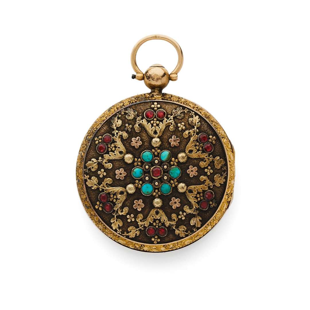 A gold pocket watch with key winding decorated with turquoise and red stones