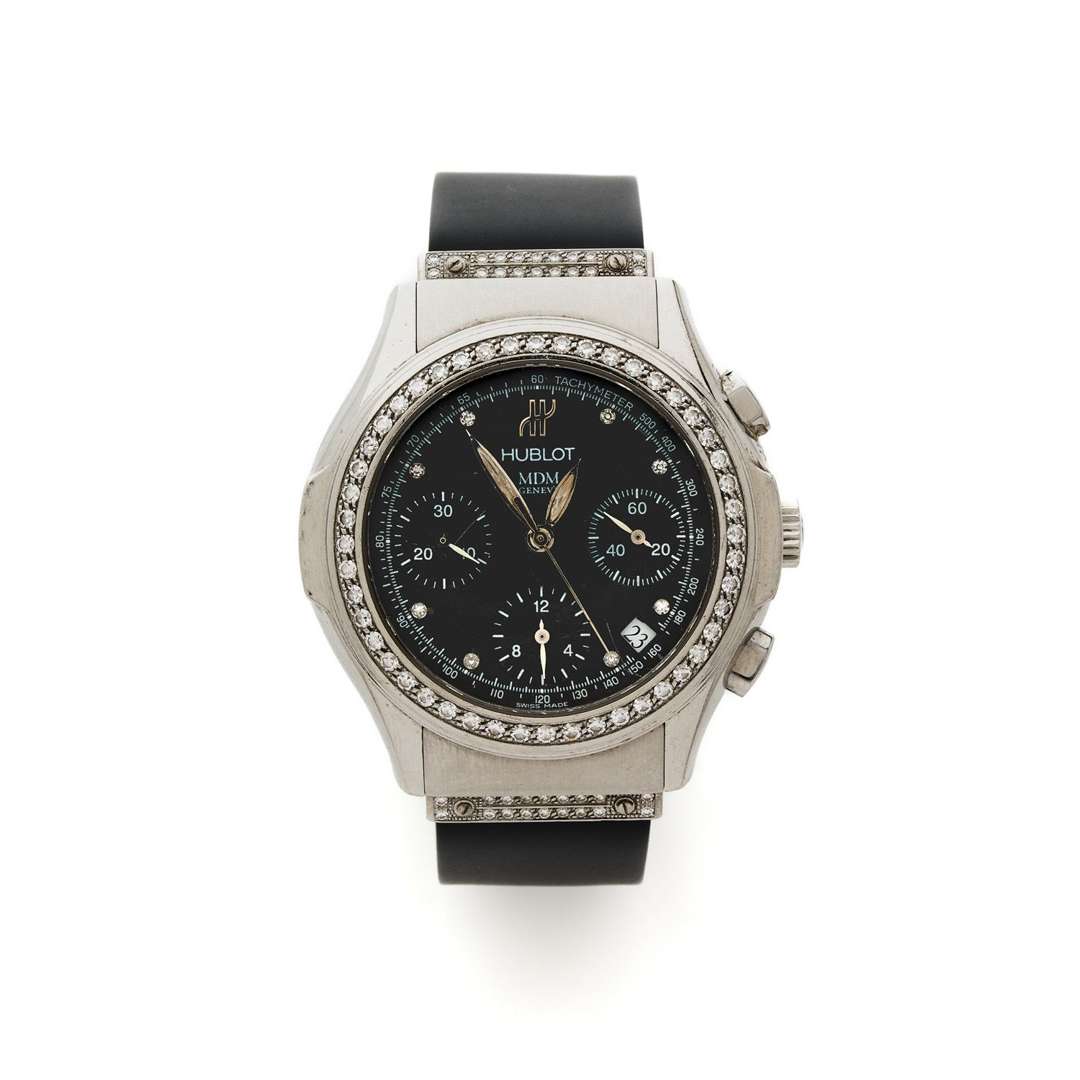 A stainless steel automatic chronograph wristwatch with « after-market » diamonds by Hublot