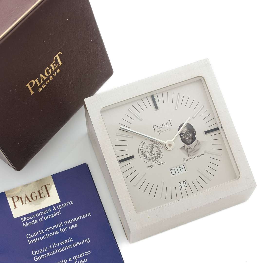 A stainless steel table desk clock with the portrait of S.E. Houphouët Boigny, signed Piaget