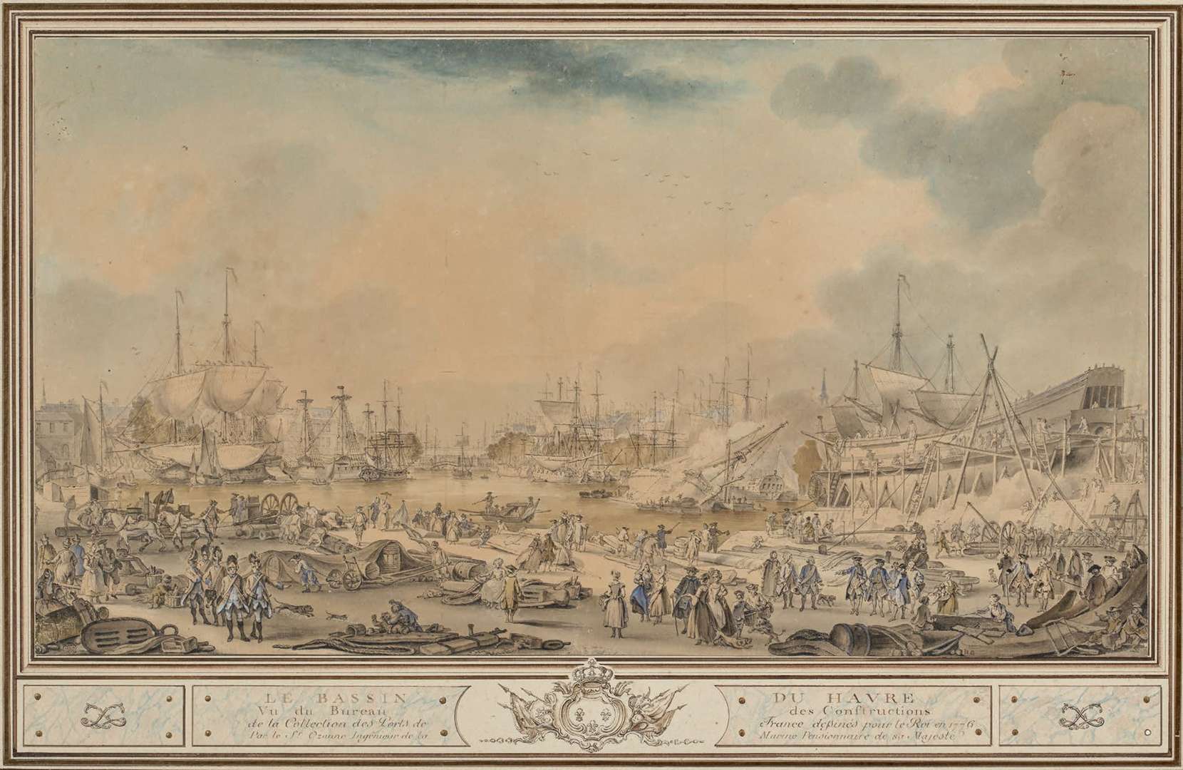 C'est à cette commande que nos deux vues du Havre doivent se rattacher. À la vérité topographique, Ozanne allie un souci d'esthétisme et de pittoresque. D'un côté, l'artiste présente une vue du port depuis la citadelle sur le Bastion du roi | de l'autre, le Bassin vu du bureau des Constructions. Minutieux, navires et architectures sont tels qu'ils devaient être et pour cause, Ozanne avait illustré en 1752 le traité Eléments d'architecture navale. Rédigé par Duhamel de Monceau, celui-ci avait cherché à définir et fixer des normes de construction navale destinées aux ingénieurs et architectes contemporains.