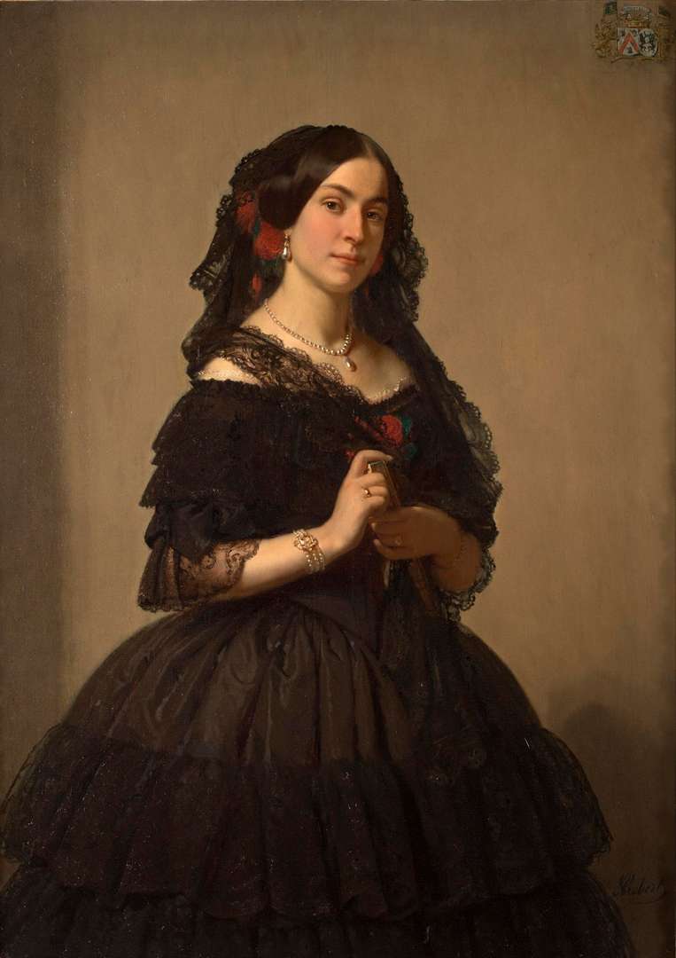 Vers 1855, il exécute le portrait de la fille du baron de Marches et de Guirsch (1802 - 1861). Cette dernière, prénommée Mathilde et née en 1832, fait alors une brillante alliance en épousant au mois d'août Ernest d'Hane Steenhuyse (1821 - 1887), VIe comte de la lignée (sur celui-ci, voir : Ch. Poplimont, Belgique héraldique, Bruxelles, 1866, pp. 195 - 196). Les armoiries d'alliance ainsi que la devise en haut à droite permettent d'identifier le modèle avec certitude. Au sommet de sa beauté, la jeune dame nous regarde fixement. Elle est habillée de soie et de crêpe noirs et sa chevelure lisse est divisée selon la mode des années 1850 au milieu du crane. La toilette est agrémentée de bijoux de perles, d'un éventail fermé et de fleurs rouges.