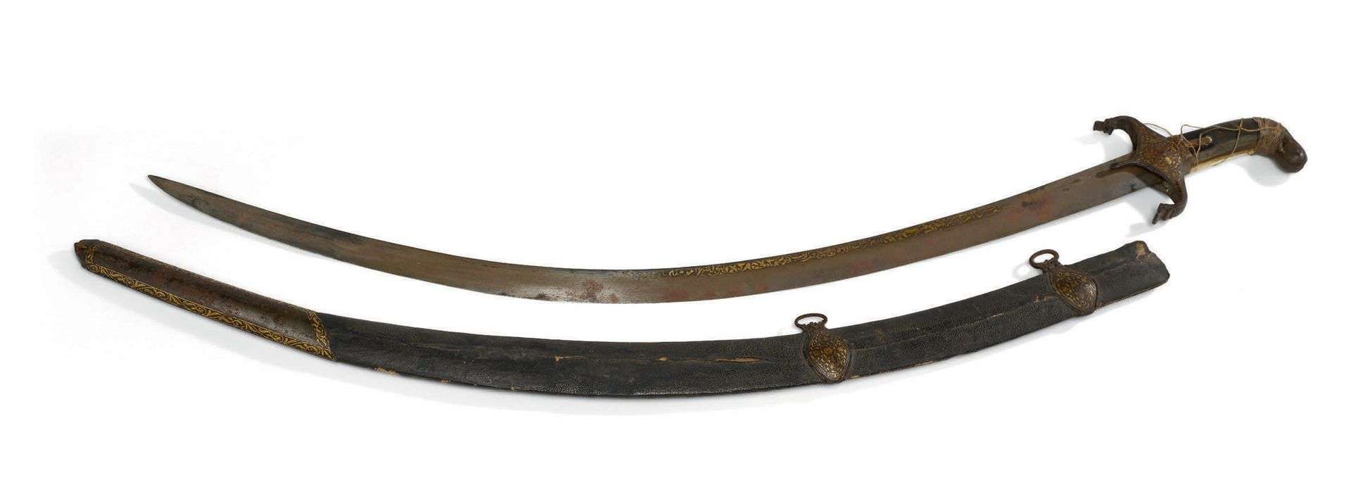 Monture en fer niellé or et corne. Pommeau en forme de crosse garni d'une pièce en fer en son extrémité. Garde à décor de frises et enroulements végétales, deux quillons courbes et croisière en baguette. Lame à forte courbure en acier damas, présence d'un texte coranique en or le long du dos. Fourreau en bois recouvert de cuir estampé à trois garnitures en fer noirci et niellées or en suite de la monture. Bracelets à bossettes avec anneaux de suspente.
