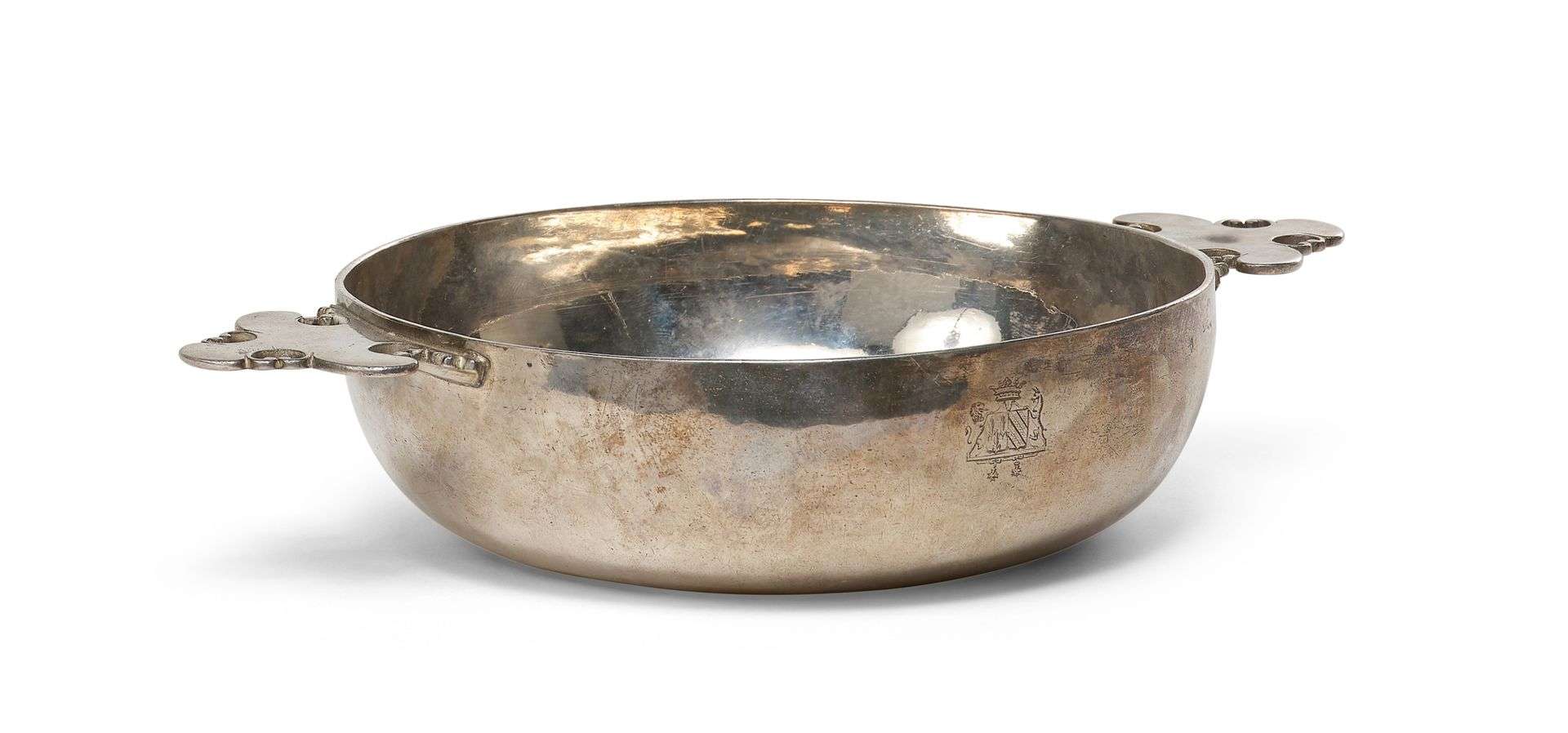ÉCUELLE DITE « BOL À SAIGNÉE » en argent uni, deux anses plates découpées et ajourées. Armoiries d'alliance sous un heaume gravées sur la panse (effacées). Maître orfèvre : non identifié (P.P. et étoile) Pas de poinçon des Fermiers Généraux, antérieur à 1672. Poinçon de maison commune illisible. France, Paris (?), XVIIe siècle. Armoiries d'alliance sous couronne de marquis gravées postérieurement.