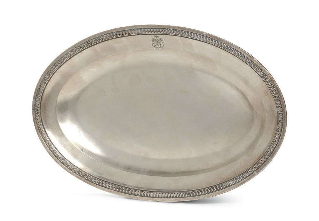 - L'un petit ovale à décor d'une frise de feuilles d'eau. Armoiries d'alliance gravées : Hay des Nétumières et Colin de La Biochaye, familles alliées en 1844. Minerve et maître orfèvre : Charles-Louis Dupré.