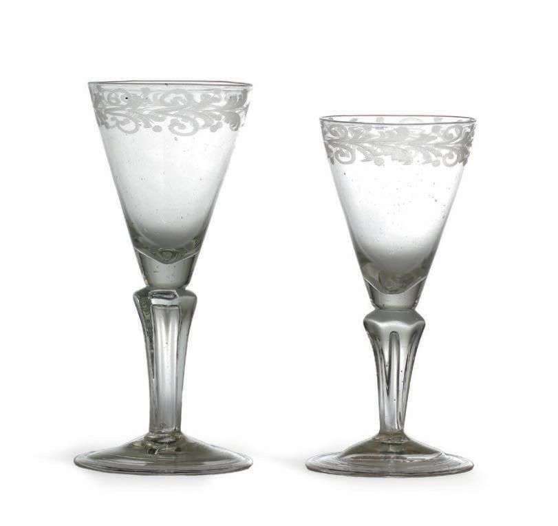 DEUX VERRES À JAMBE en verre incolore, la coupe en cornet gravée à la roue de rinceaux. Jambes creuses à section hexagonale.