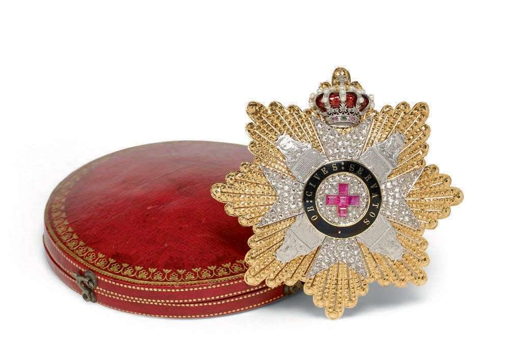 Plaque de Grande-Croix| en or jaune à huit branches taillées en pointes, au centre une croix en platine sertie de diamants alternant avec des têtes de lions issantes de tours en platine (symbole de la Castille et du Leon). Au centre une croix en rubis entourée par la devise « OB : CIVES : SERVATOS » en or et émail. La croix en platine est surmontée d'une couronne en platine et émail rouge sur fond guilloché ornée de perles, de deux saphirs triangulaires, et de deux rubis encadrant une émeraude. Au revers : épingle et deux crochets. XIXe siècle.