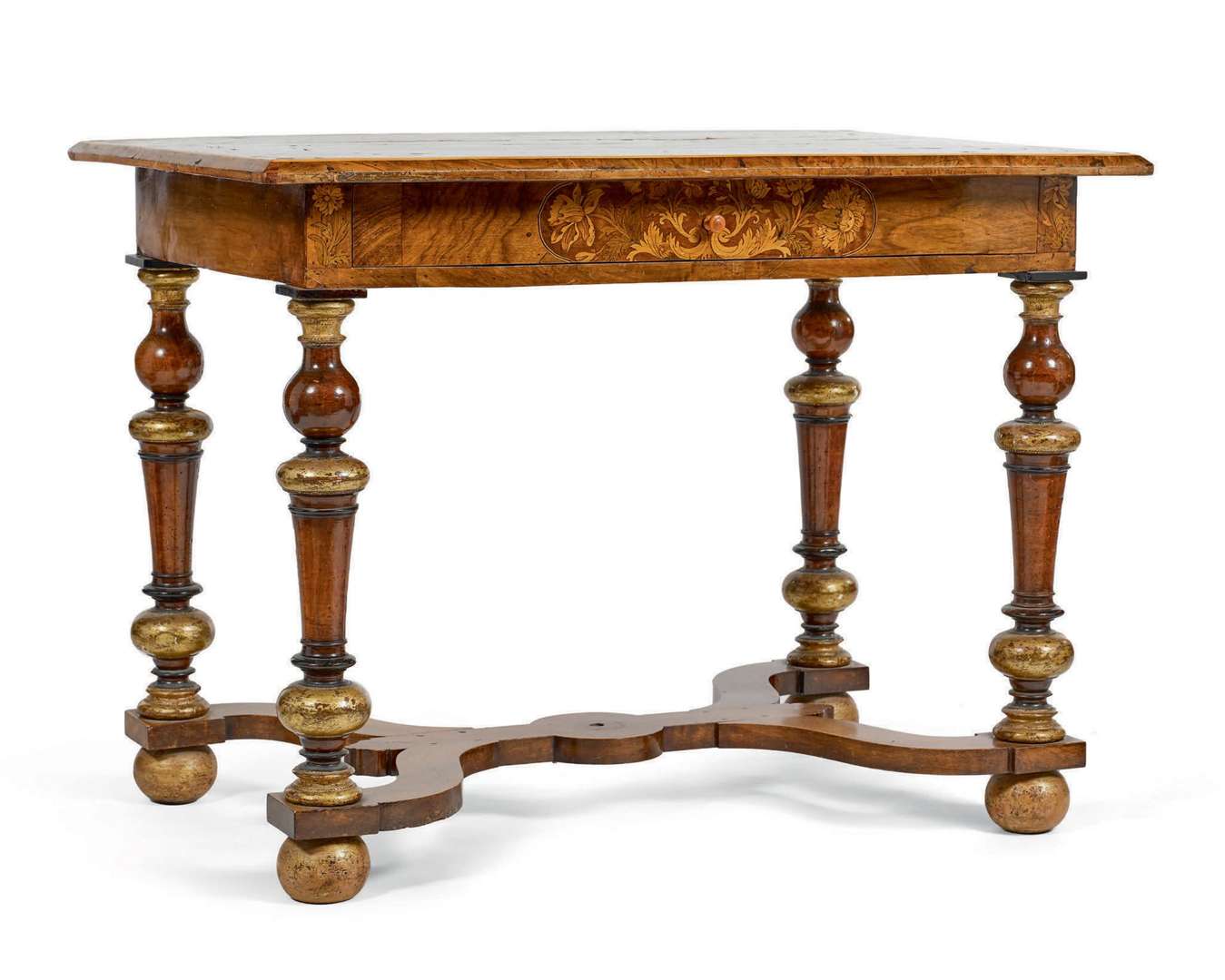 TABLE LOUIS XIV rectangulaire. Le plateau à riche décor de rinceaux et bouquet de fleurs insérés dans des réserves. La ceinture droite ouvrant à un tiroir et reposant sur quatre pieds tournés à bagues en bois doré et réunis par une entretoise en H mouvementée.