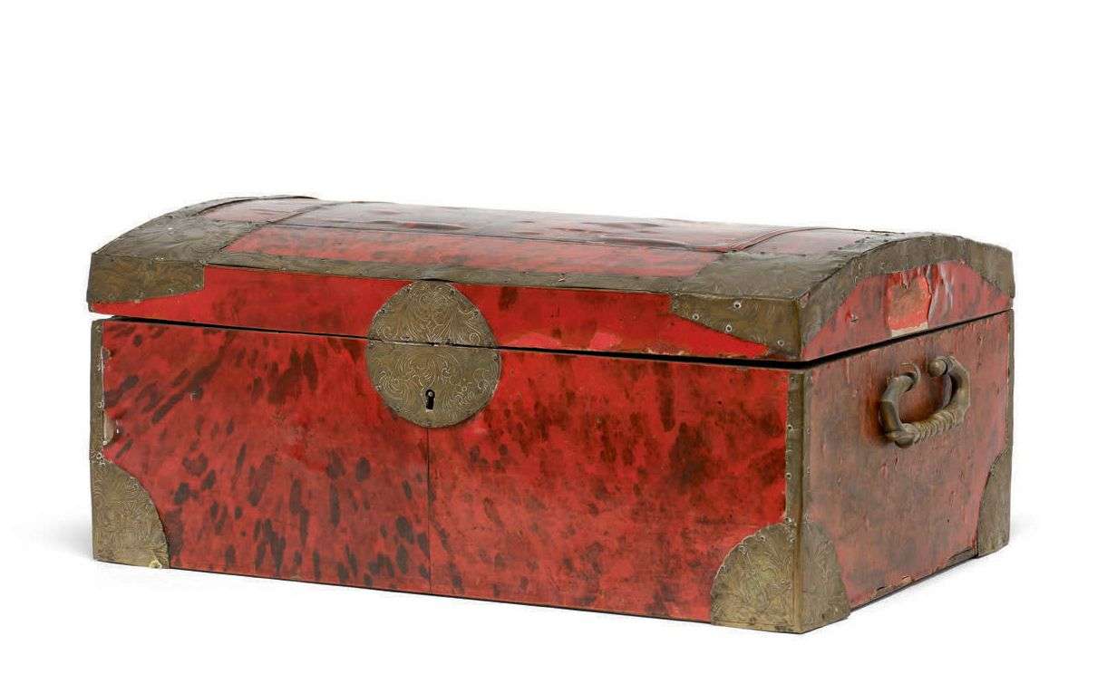 ~ GRAND COFFRET rectangulaire, le couvercle de forme bombée, en placage d'écaille teintée rouge.