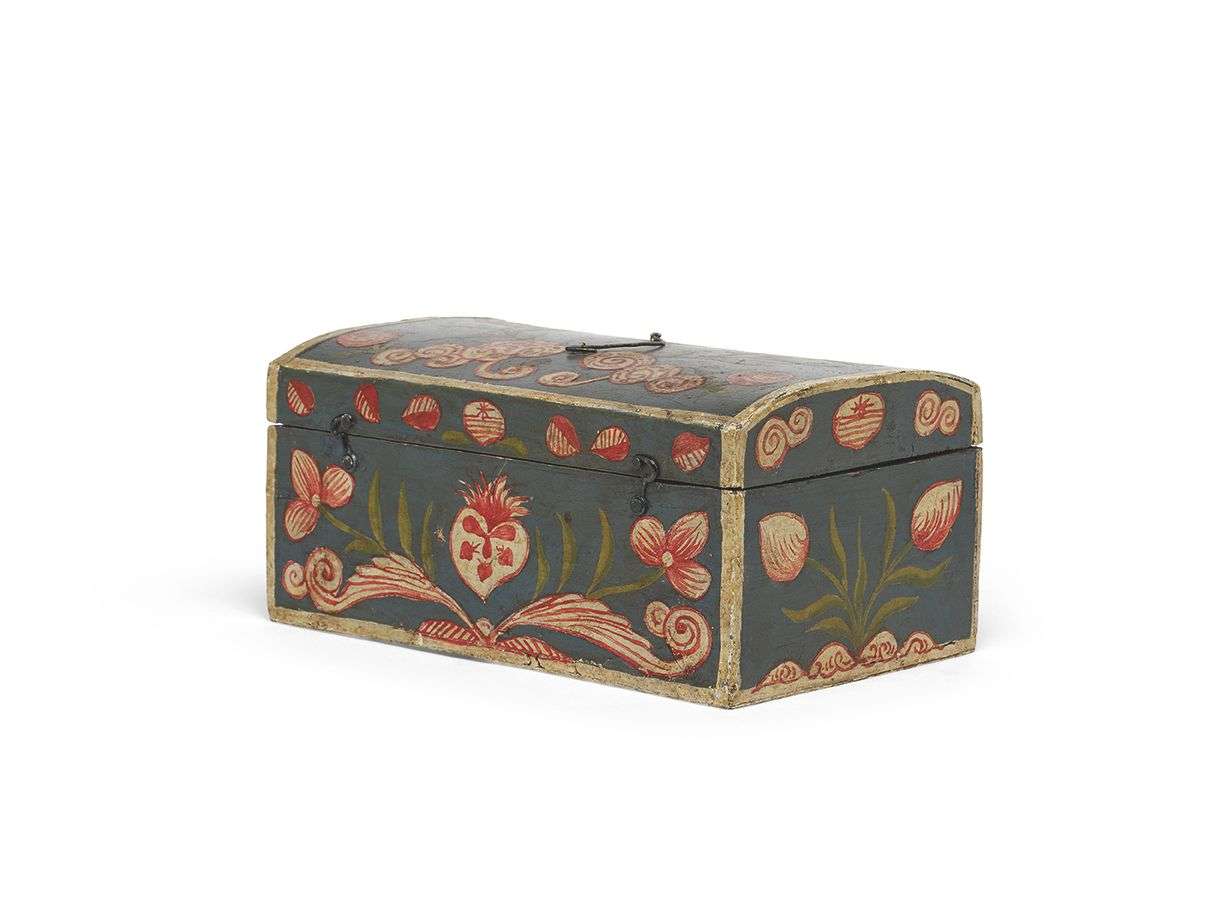COFFRET DE MARIAGE en bois peint polychrome à décor de fleurs, le couvercle bombé. Porte la date 1826sur le dessus.Art populaire, Normandie - Début XIXe siècle.