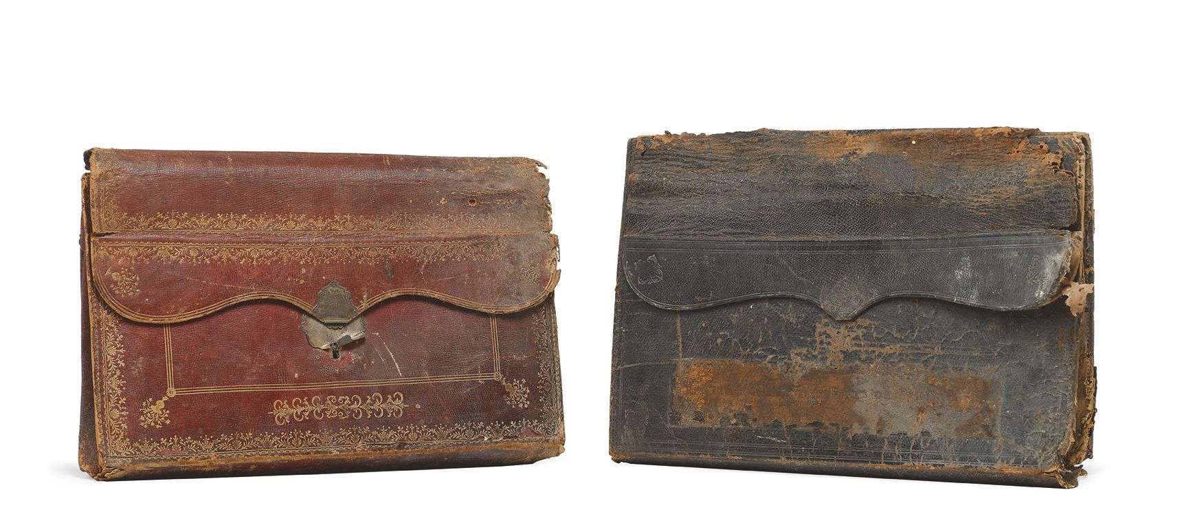 LOT DE DEUX GRANDS PORTEFEUILLES en cuir, l'un noir nominatif portant l'insciption : « M de La Lande Magon / Trésorier Gal des États de Bretagne / N° I » avec fleurs de lys aux écoinçons. L'autre en maroquin rouge à fin décor doré aux petits fers et attache en argent gravée aux armoiries épiscopales non identifiées (écu coupé émanché).