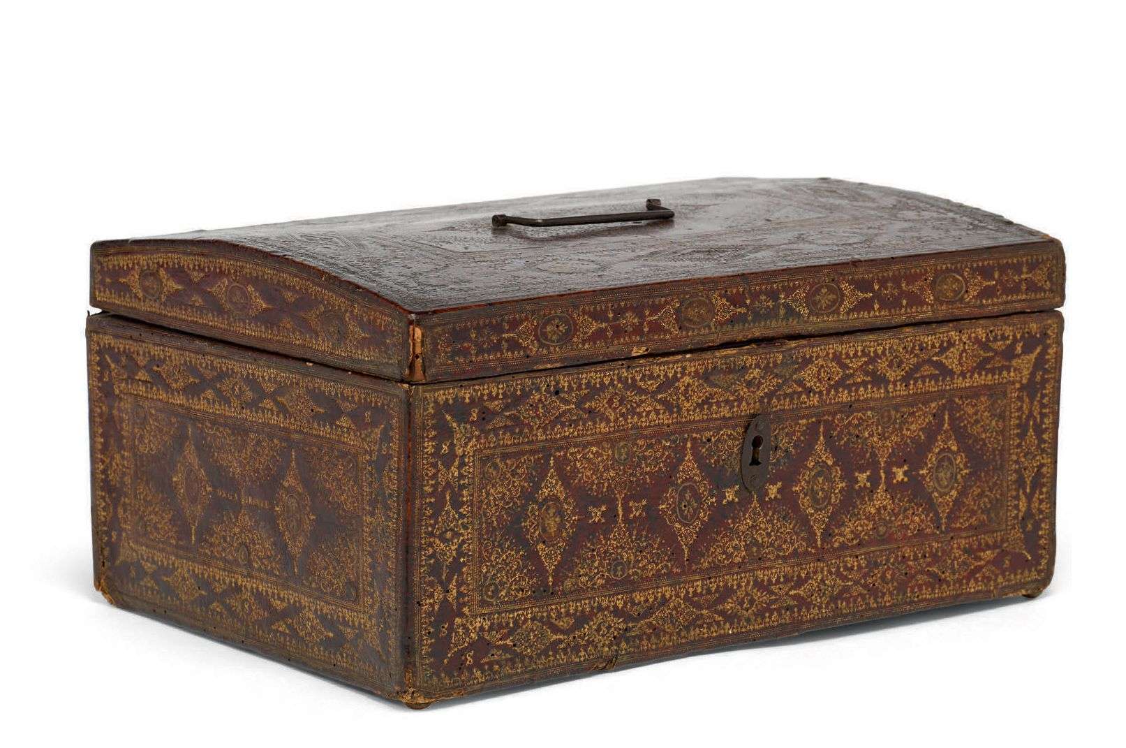 COFFRET DE VOYAGE rectangulaire à âme de bois recouvert de cuir maroquin rouge et pastilles fauves richement doré aux petits fers au thème de l'amour : coeurs transpercés de flèches, flammes de la passion, fermesses. Les côtés nominatifs indiquant en lettres d'or « DEGAIRAVLD » et « CLERE*DELOM ». Poignées et entrée de serrure en fer forgé.