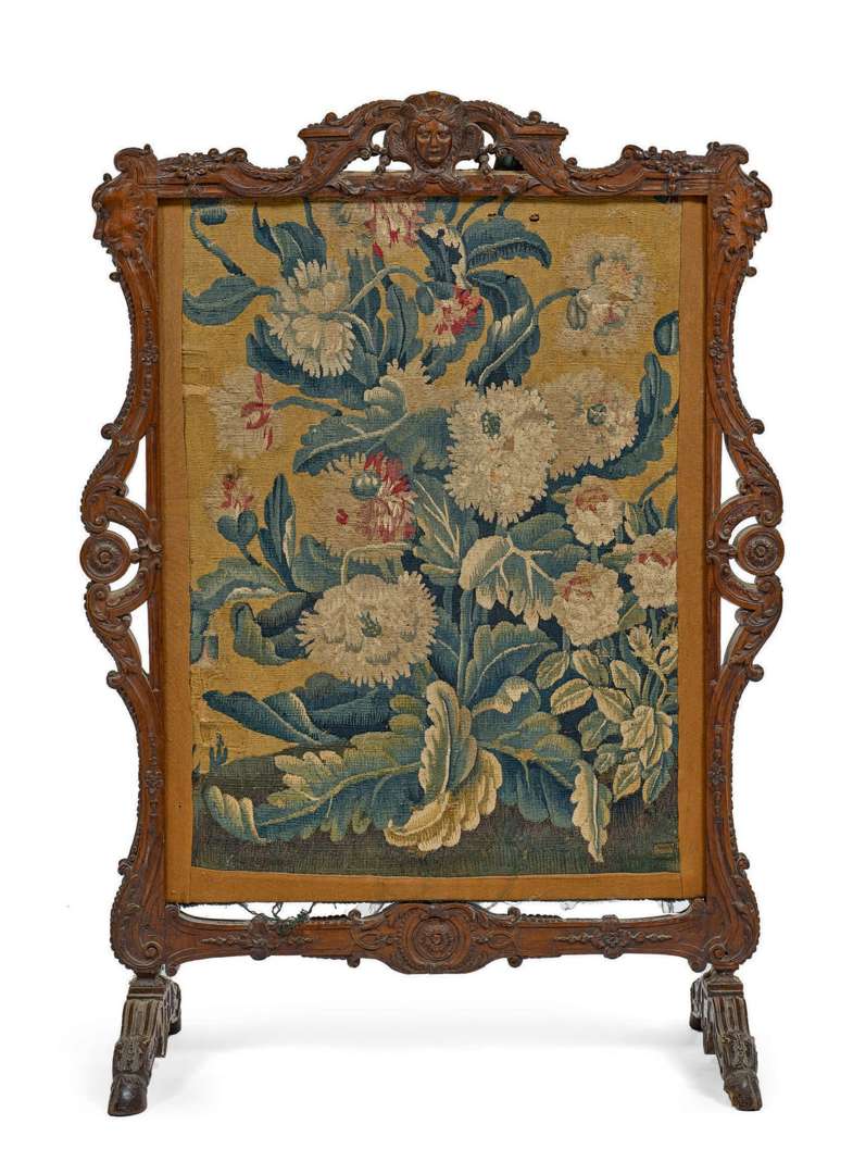 GRAND ÉCRAN DE CHEMINÉE en bois (noyer ?) mouluré et finement sculpté à riche décor de masques d'espagnolettes et d'hommes sauvages, rinceaux fleuris, volutes et fleurons. Il repose sur des pieds en patin terminés par des sabots fendus. Époque Régence, vers 1720 / 1730