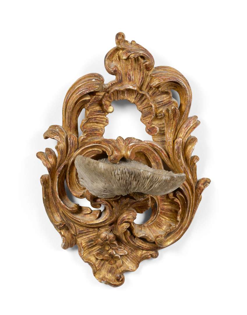 BÉNITIER formé d'un corail champignon (Fungia fungites) monté sur un support de bois sculpté et doré de rocaille, feuillages et fleurette.