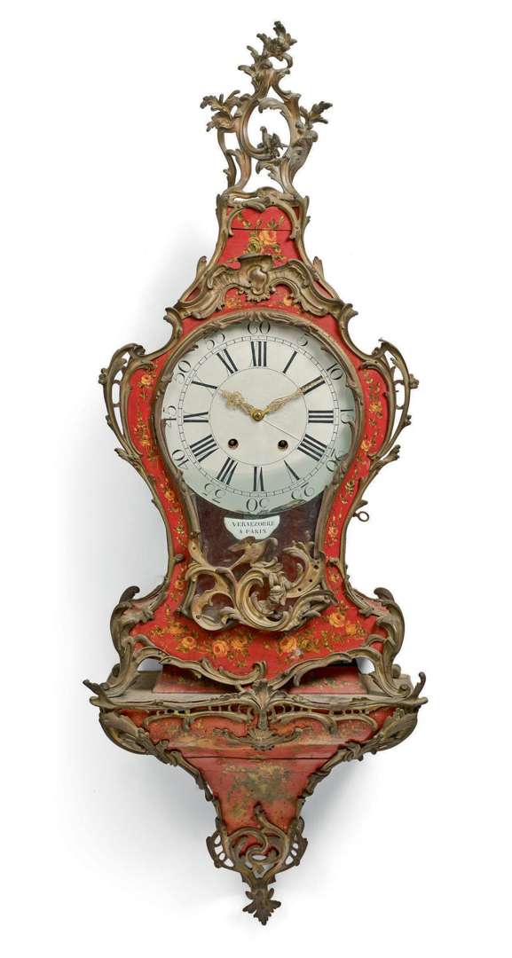 Cartel mural et sa console d'applique en décor peint de vernis européen à fond rouge, la caisse de forme violonnée. Ornementation de bronzes chantournés. Cadran en fixé sous verre et cartouche émaillé signé Vernezobre à Paris. Suspension à fil.