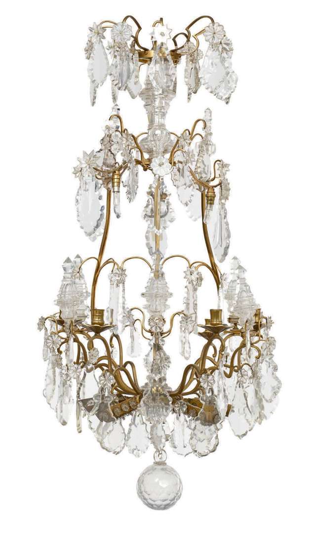 LUSTRE CAGE en métal et verre taillé, il offre six bras de lumière. Nombreuses pampilles et poignards de verre taillé.