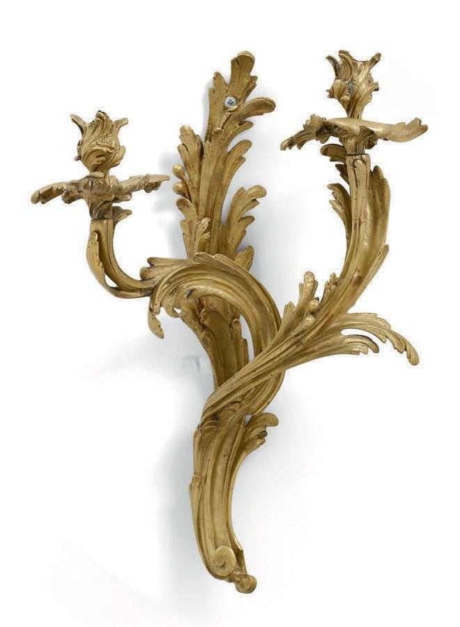PAIRE D'APPLIQUES en bronze doré, en pendants, à deux bras de lumière, de forme chantournée rocaille.
