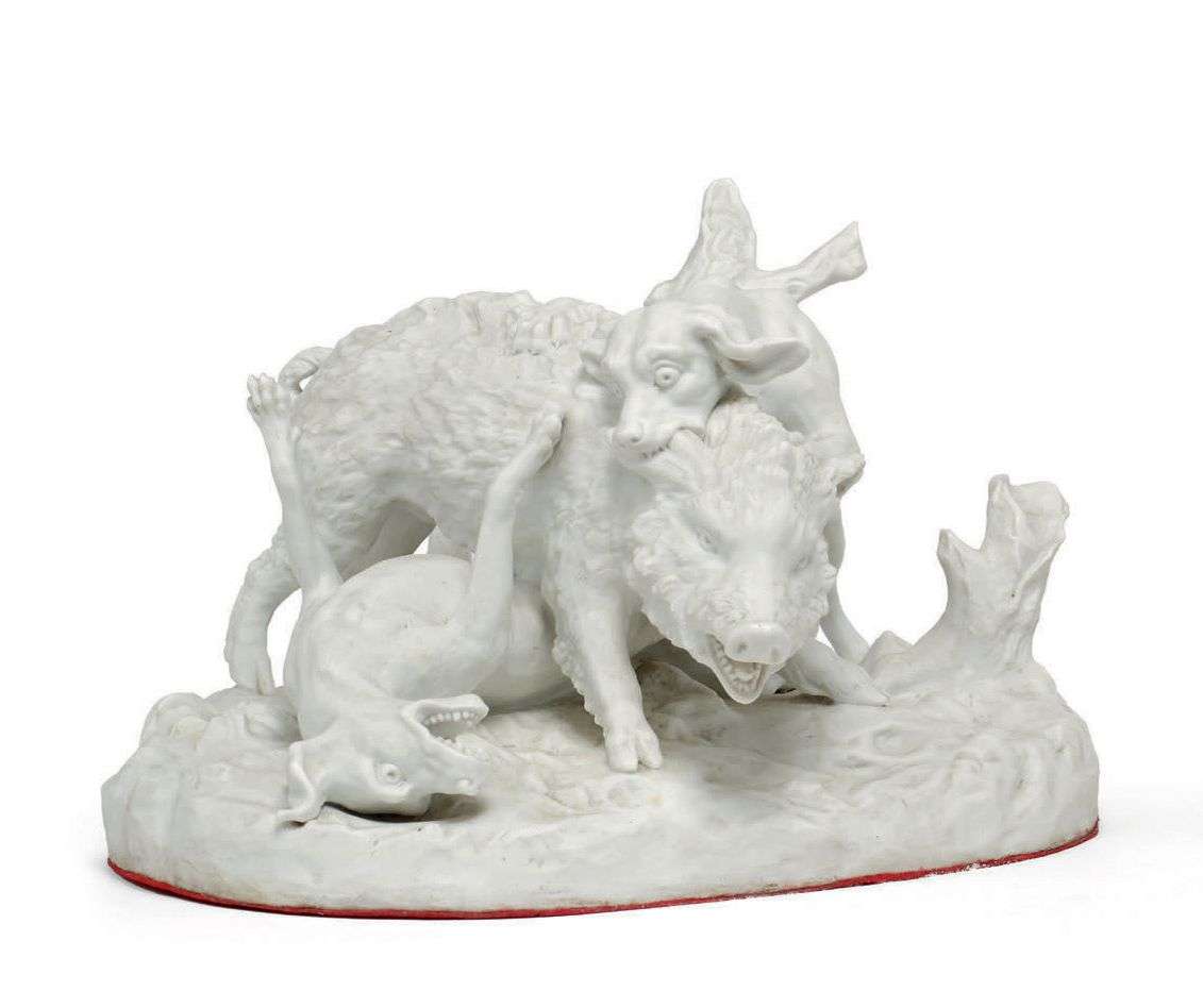 DEUX SURTOUTS DE TABLE en biscuit de porcelaine blanche représentant l'hallali du loup et l'hallali du sanglier d'après les modèles de Pierre Blondeau d'après les compositons de Jean-Baptiste Oudry.